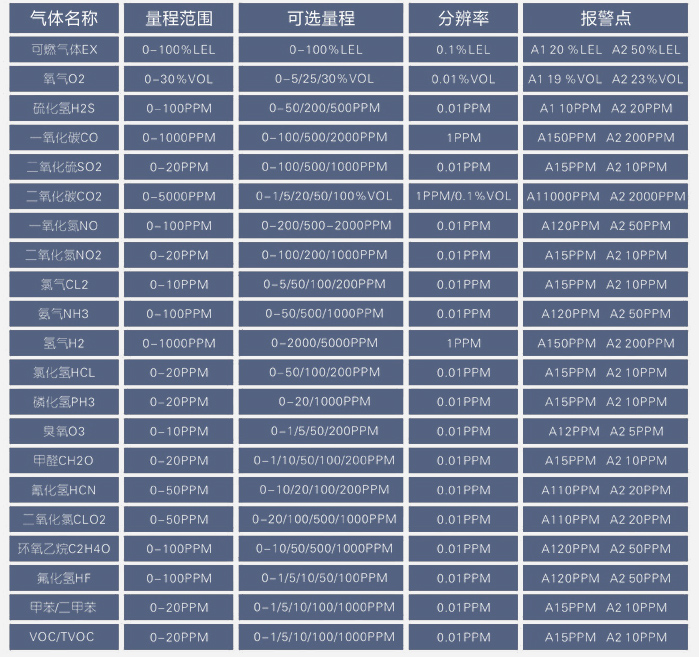 氣體檢測儀不同氣體量程范圍、分辨率分別是多少